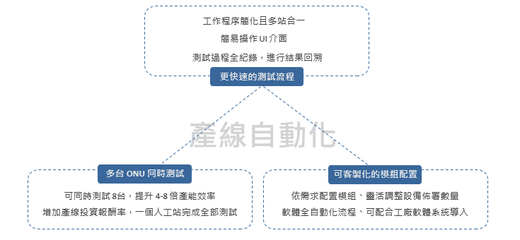 ONU 產線整合測試方案 聯恩電子的整合測試方案,其特點包含: 相容性 – 可兼容 GPON / EPON / XGPON / XGSPON 整合性 – 包含誤碼、眼圖、流量、連線、LED 測試等 高效率 – 最多 8+8 台 ONU 同時進入測試,提供高產出 自動化 – 軟硬體整合,自動化一站式測試 提高測試效率:測試時間更短、同時測試數量更多 高度客製化:軟體工程師可直接協助產線流程整合 一站式整合:整合所有 ONU 需要的測試,簡易設置快速上線 跨區服務:台灣、越南、中國皆可到廠服務 光分析儀自動化測試 註冊及流量測試