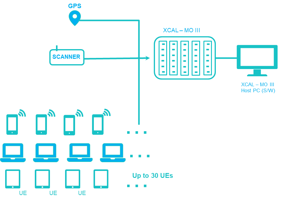 XCAL-MOIII - BENCHMARKING PRODUCT (20/30UE) 可同時支援30部手機的基準測試解決方案 在多個服務運營商,網路中的各種品牌手機之間進行Benchmarking測試。 支援多個連接,最多可並行連接30部手機,具有完整的測量功能,並且通過連接多個XCAL-MOIII。 每個插槽都有一個嵌入式CPU和針對所有無線網路的測量進行了優化的內存。 支援自動呼叫測試方案並使用多個設備運行基本測試。 最多有5個插槽的插槽結構的硬體解決方案。 XCAL-MOIII 系統配置圖