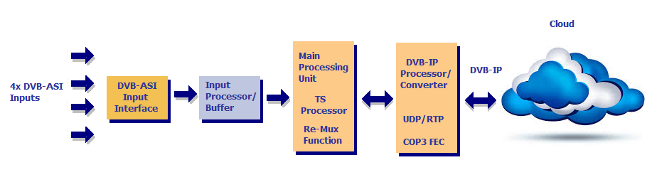 Converts HD and SD MPEG-2 or H.264/MPEG-4 AVC transport streams from DVB-ASI to IP in real time.
