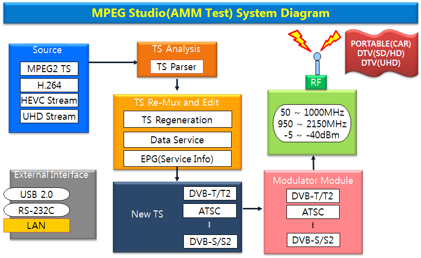 AMM Test is the integrated equipment which can Analyze MPEG TS, HEVC stream, Modifying and Transmitting immediately. (MPEG Analyzer, Editor, RF Generator unified and supports all digital broadcasting specifications: DVB-T2(MPLP, T2-MI), ISDB-T, DVB-S/S2)