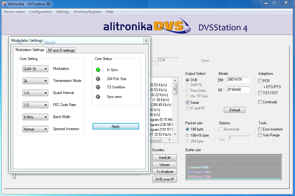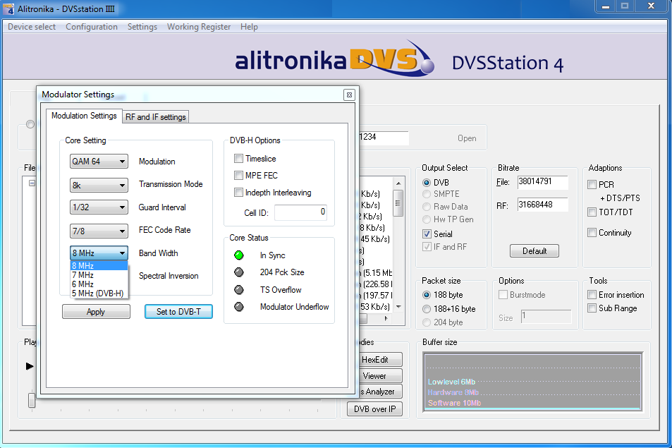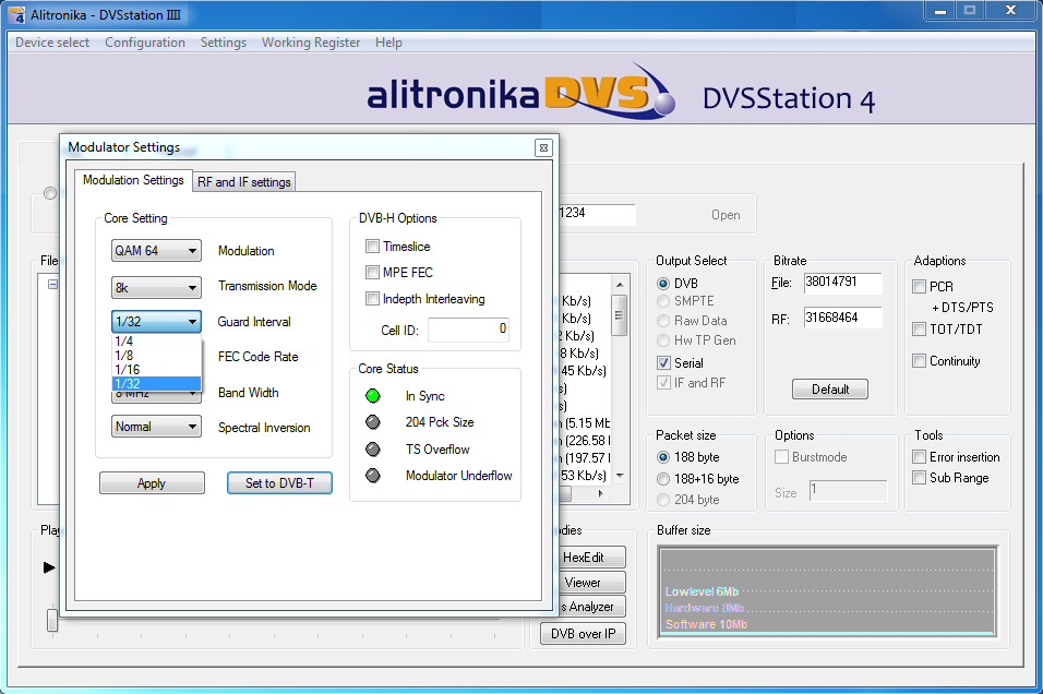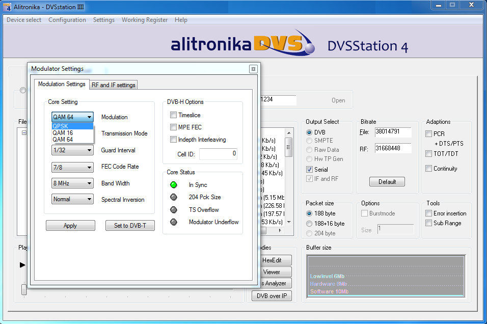 Supports Burst or continuous modes, 188 and 204 packet sizes.