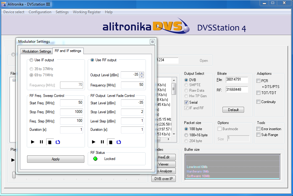 RF Output Power over bandwidth:+2dBm to -35dBm, adjustable in 0.5dB steps.