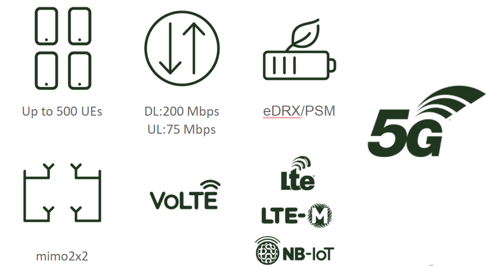 它充当符合3GPP规范的eNodeB、gNodeB、EPC和5GC,允许对NR(SA模式)、LTE、LTE-A、LTE-M和NB-IoT设备进行功能和性能测试。设备由集成的IMS服务器以及用于VoLTE和eMBM测试的eMBMS闸道器完成。