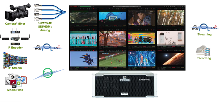 - 单机支援最多12个频道输入不同来源的音视频分别进行编码 / 解码 / 转码 / 侧录