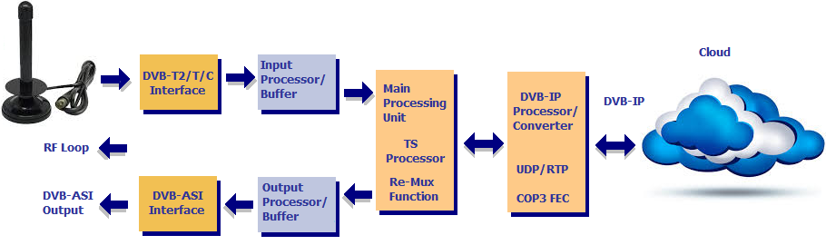 Combined DVB-T2/T/C to DVB-IP/DVB-ASI Converter.