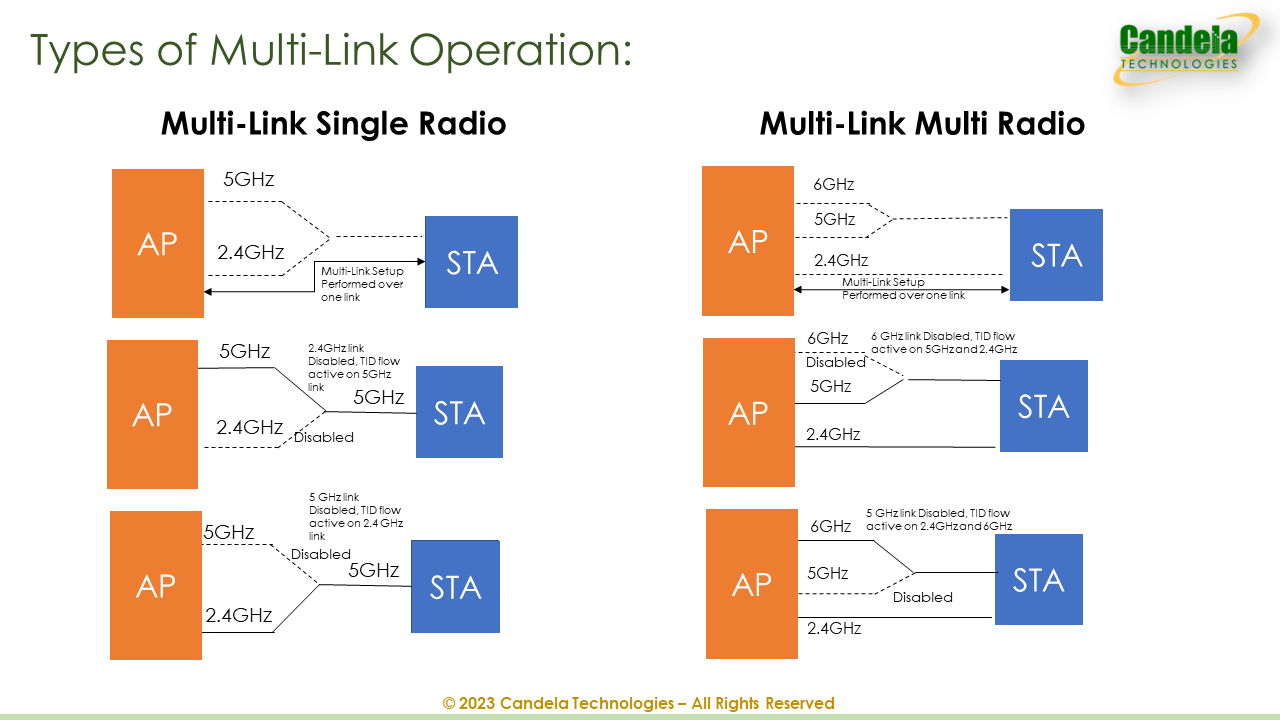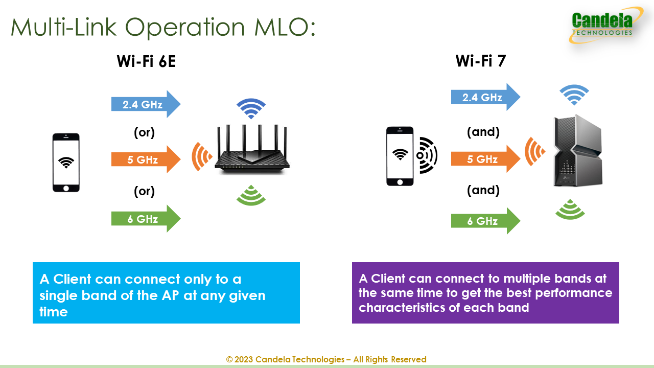 Candela WIFI 7 Testing解決方案引入了Multi-Link Operation (MLO) 等開創性功能,讓WiFi設備能夠同時利用多個頻段。這一突破性功能使得在6GHz頻段的AP附近實現高吞吐量,同時在2.4GHz頻段與AP距離較遠的地方保持持續連接。