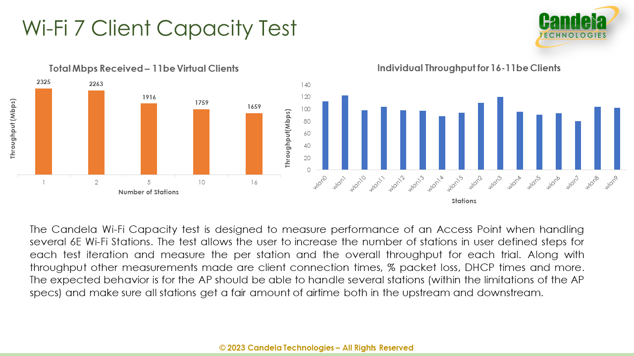 The Candela WIFI Capacity test is designed to measure performance of an Access Point when handling several 6E WIFI Stations. The test allows the users to increase the number of stations in user defined steps for each test iteration and measure the per station and the overall throughput for each trial. Along with throughput other measurements made are client connection times, % packet loss, DHCP times and more. The expected behavior is for the AP should be able to handle several stations (within the limitations of the AP specs) and make sure all stations get a fair amount of airtime both in the upstream and downstream.