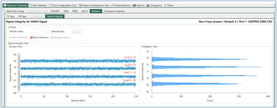 透過SIV,使用者能輕鬆分析112G PAM4訊號的損耗和噪聲。範例視圖清晰展示了訊號損耗和噪聲的影響。右側直方圖視圖顯示了每個切片的分布形狀,使得容易辨別每個切片(eye-diagram)的特徵。在訊號傳輸時,會受到多種因素的影響而衰減,如固有電阻、頻寬限制、電感耦合和阻抗失配等。當訊號出現失真時,"切片"會變得較為閉合,可能導致位元錯誤。