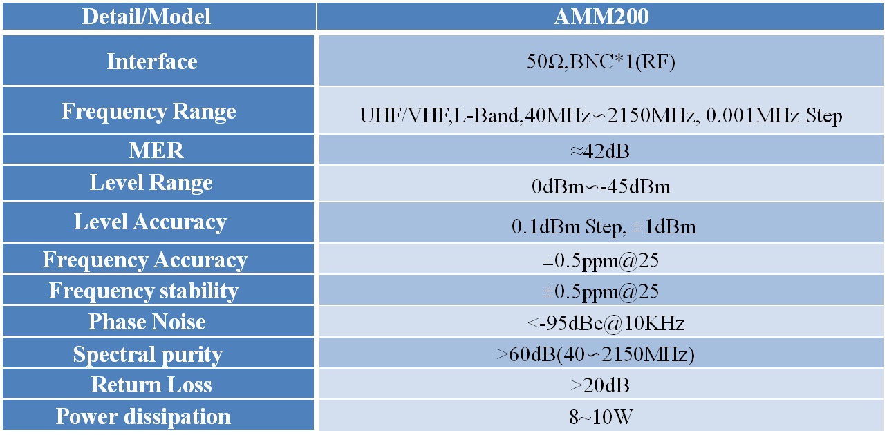 Used for test and measurement purposes, such as R&D testing, factory testing, and QA testing of tuners, demodulator chips, receivers, televisions, etc.