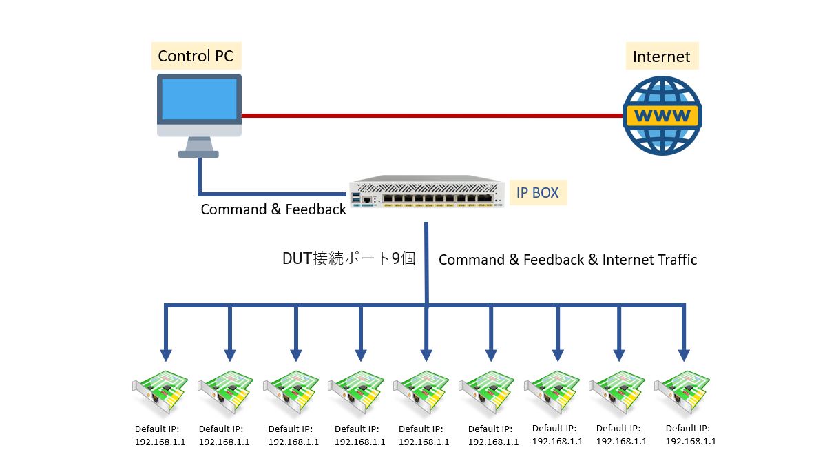 如果需要,DUT 也可以透過 IP BOX,經由控制電腦連到外部網路。