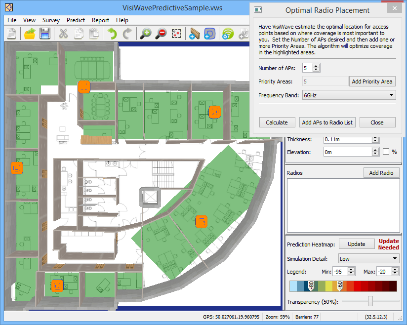 VisiWave Pro現在支援建議無線接入點(AP)的最佳放置位置,適用於預測性調查。您只需指定區域的障礙物(牆壁),並告知VisiWave您認為在該區域需要多少個AP,VisiWave將為您確定AP最佳的安裝位置。您還可以標記調查區域中的“優先區域”。例如,經常需要Wi-Fi連接的辦公桌區域可以被標記為優先區域。VisiWave會在計算時優先考慮優先區域的覆蓋範圍。