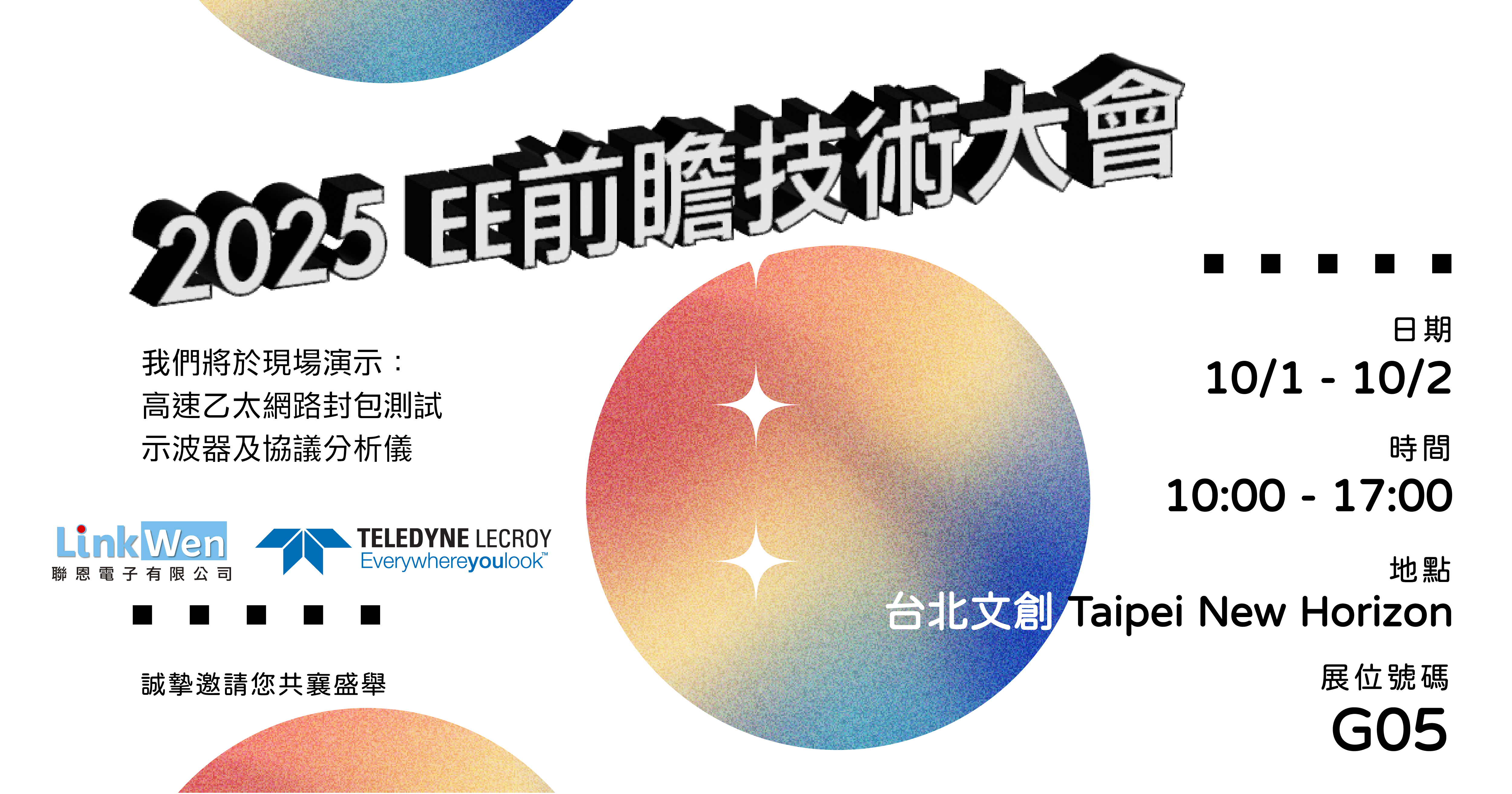 隨著高速網路與電子產品測試需求的快速提升,聯恩電子將於 2025 [ EE前瞻技術大會] 攜手 Teledyne LeCroy 展示 "高速乙太網路封包測試" 與 "高解析度示波器及協議分析儀",為產業帶來最新的量測解決方案。