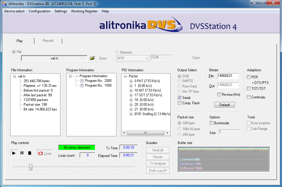 Làm thế nào để tất cả hoạt động? Khi phát hoặc ghi luồng truyền tải bằng thiết bị của Alitronika, hầu như không cần bất kỳ sức mạnh xử lý nào. Điều này là do thực tế là các thiết bị của Alitronika là thiết bị dựa trên phần cứng nên phần cứng thực hiện tất cả các chức năng. Điều này trái ngược với các thiết bị do các nhà cung cấp khác cung cấp , thường là các thiết bị được đổi thương hiệu với việc bổ sung phần mềm ứng dụng của họ. . Bằng cách bổ sung thêm sức mạnh xử lý cần thiết, AT140USB có khả năng phát lại bất kỳ tệp TS nào có tốc độ lên đến 50Mb / s. Các tệp TS để phát lại có thể được ghi trên thiết bị Compact Flash theo 3 cách, bằng cách kết nối luồng DVB-ASI với đầu vào DVB-ASI của AT140USB, sử dụng DVSStation3, phần mềm ứng dụng miễn phí của Alitronika hoặc đơn giản bằng cách đặt thiết bị Compact Flash vào bất kỳ Cổng đọc Flash nào của PC / Máy tính xách tay và chỉ cần sao chép các tập tin vào đó.