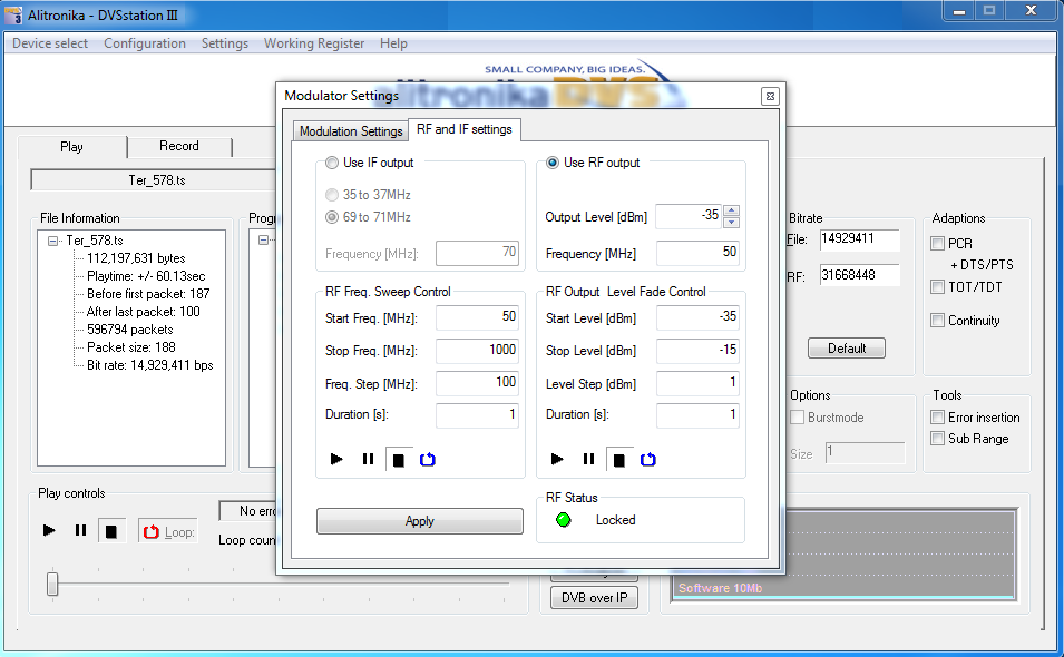 Đầu ra DVB-ASI để theo dõi tệp TS đã điều chế.