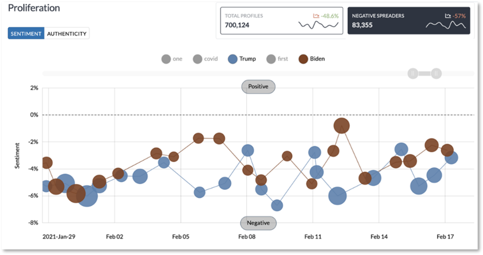 Người dùng có thể phân tích lưu lượng của các chủ đề phổ biến, lượng thông tin trên mạng xã hội; và sự phổ biến trong cuộc thảo luận về những nhân vật biểu tượng thông qua phân tích lưu lượng mạng, điều này có thể được áp dụng vào quảng cáo tiếp thị hoặc quản lý thương hiệu. Phân tích dữ liệu mạng xã hội công cộng thông qua học máy và sử dụng các công cụ tâm trạng (Bộ phân tích NLP) cho phép người dùng đánh giá tác động và sự lan truyền của chủ đề.